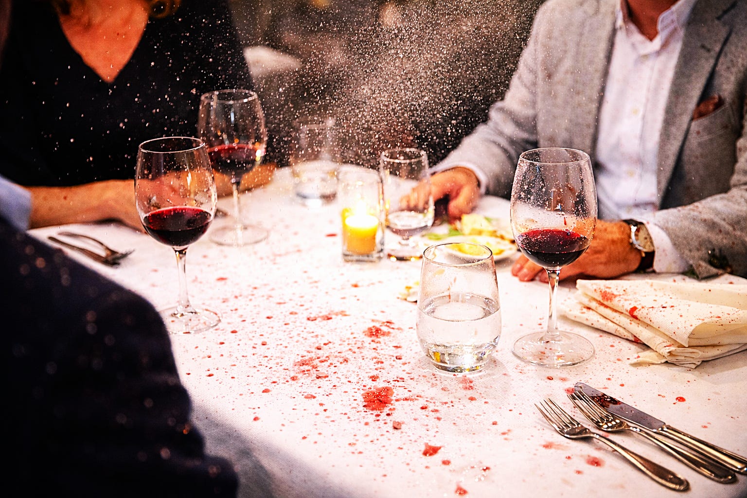 A fine Barolo spray, all over the table and the guests.