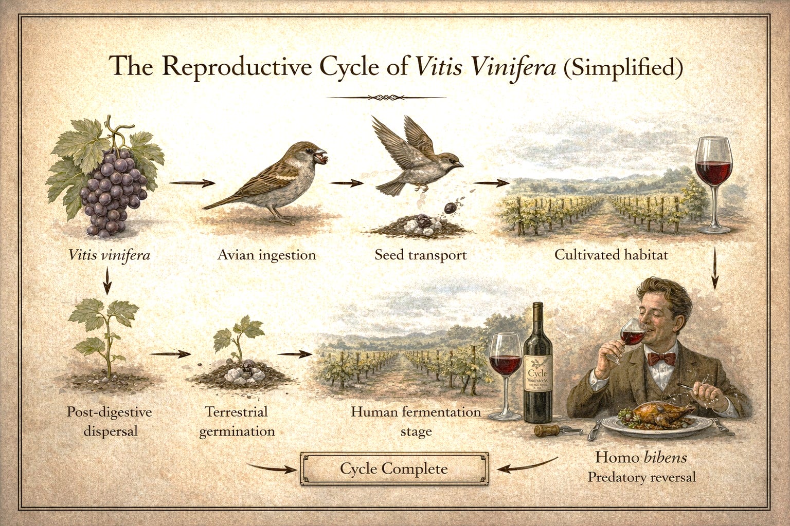 So, you see, before there were vineyards, before there were appellations, and before there were sommeliers explaining minerality to confused guests, the grape berry had already perfected a method for expanding its territory.