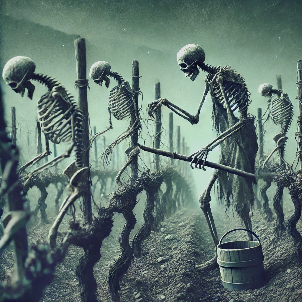 This next tale is one of vineyard ruin and despair, where the land itself turned against the winemakers and death came creeping on tiny feet, like a dream I had last night - the Grim Reaper with tiny hands and feet. I think I ate too much cheese again.