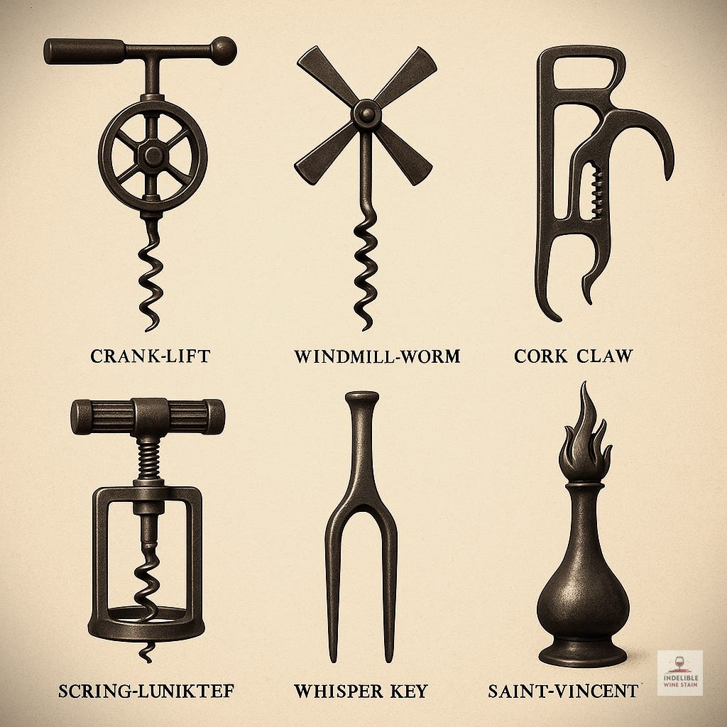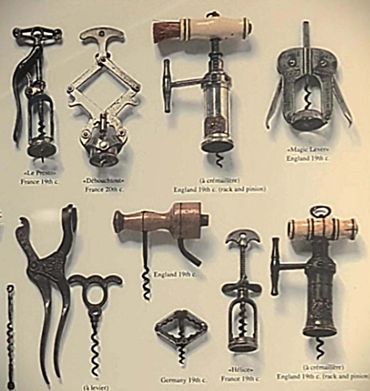 There were other contraptions: the crank-lift, the windmill worm, the cork claw, the spring-loaded waiter-killer, the Whisper Key (said to open bottles through voice resonance), the Scring-Luniktef, Randolph’s Scissors and of course, who could forget the infamous Saint-Vincent Flame Spout, which required a candle, a chant and a priest with knowledge of the Secret Bacchusian Cults. Those were the days… so many options.